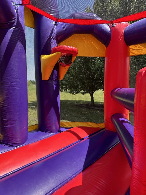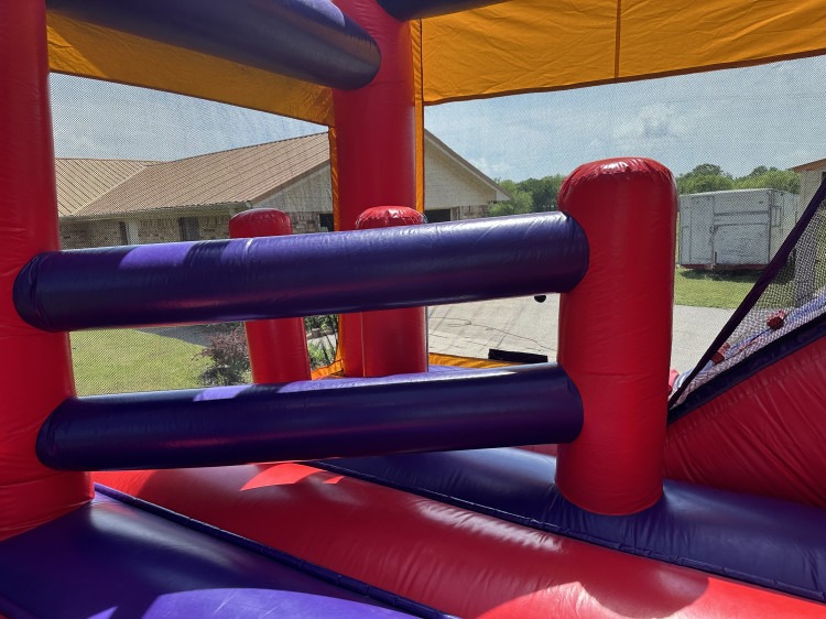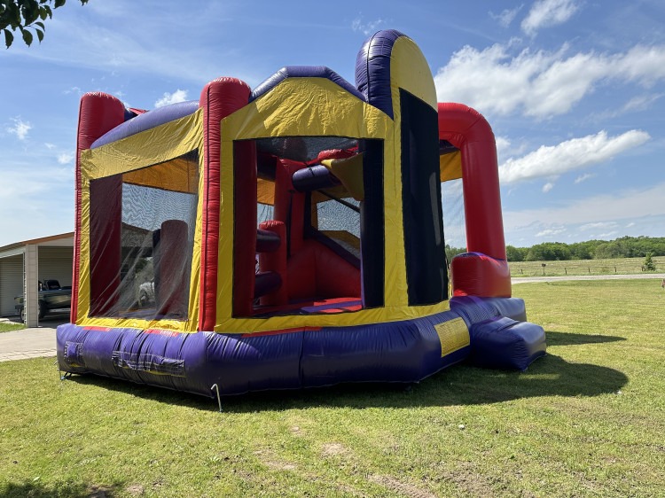 Obstacles, basketball hoop, and a slide this modular combo is the perfect fit for any party.