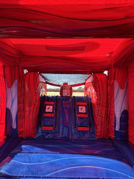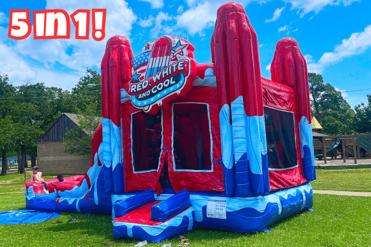 This patriotic-themed inflatable brings nonstop fun with a bounce house, dual lane slide, climbing wall, and basketball hoop—all in one unit! Perfect for summer parties, 4th of July events, or any celebration that needs a splash of red, white, and cool. Can be used wet or dry.